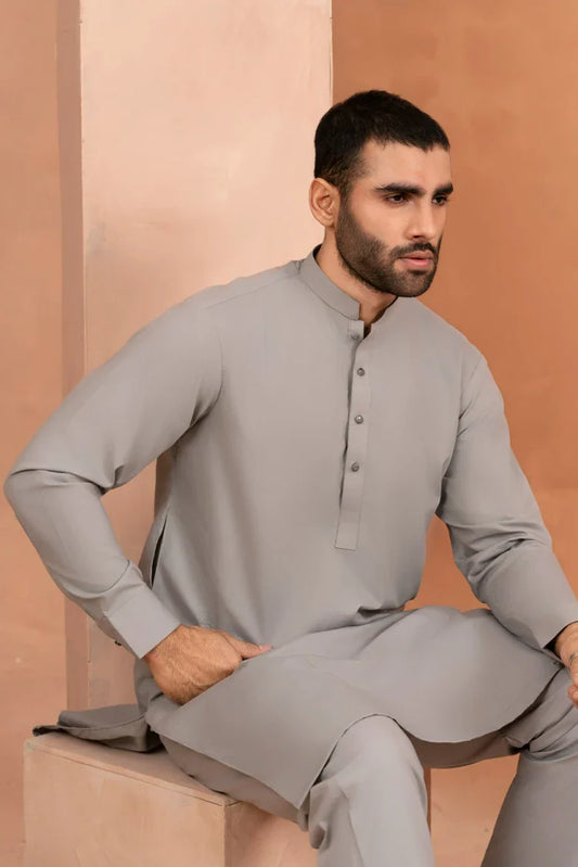 Picture of Ash Grey Blended Stitched 2 Pc with Band Collar and Buttoned Placket - Available at Raja Sahib