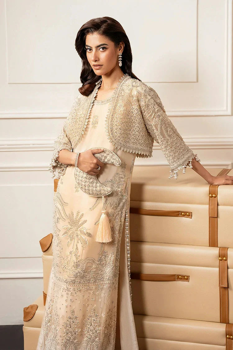 Step Into Elegance With Creme In Serene Cyan, A Harmonious Blend Of Intricate Embroidery And Fluid Silhouettes. The Chiffon Shirt And Sleeves, Paired With An Embroidered Jacket, Raw Silk Trousers, And A Beautifully Detailed Dupatta, Radiate Effortless Grace And Modern Sophistication