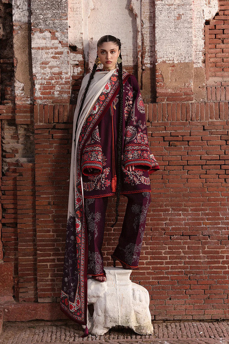 Description: A Tribute To Heritage Craftsmanship, This Deep Purple Ensemble Features A Beautifully Crafted Shirt Adorned With Intricate Multicolor Traditional Embroidery, Reflecting Timeless Artistry. The Sleeves Are Richly Embroidered In Matching Hues, Adding Depth And Continuity To The Design. Paired With A Monochrome Embroidered Trouser And A Printed Wool Shawl, The Outfit Embodies Classic Grace And Cultural Sophistication.