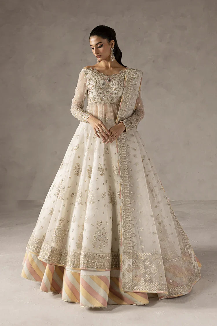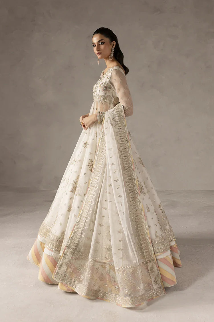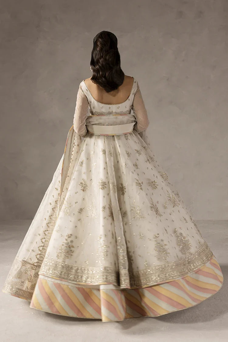 The embellishments include delicate kulfi motifs, shimmering drops, and captivating bethki patterns, each designed to enhance the dress’s grandeur. The opulent Japanese cut dana work adds a touch of refinement, while the traditional ghota detailing lends a regal charm.