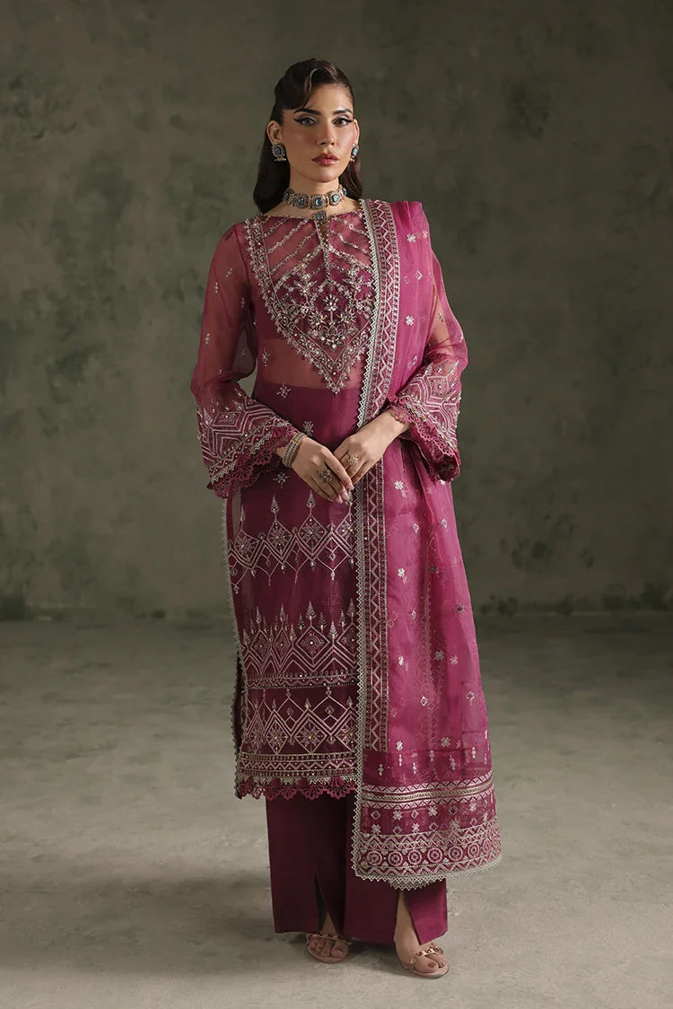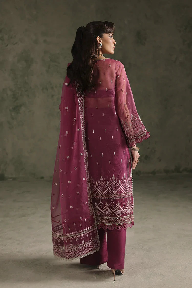 A 2.75-yard embroidered organza dupatta adds an ethereal touch, completing the look with graceful drape. Paired with 5 yards of dyed raw silk trouser and lining fabric, the outfit balances luxury with structure. Perfect for festive occasions and formal gatherings, this design is a true reflection of craftsmanship and timeless style.