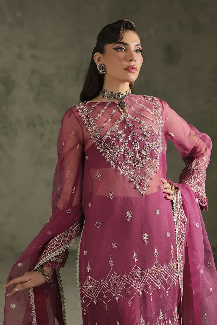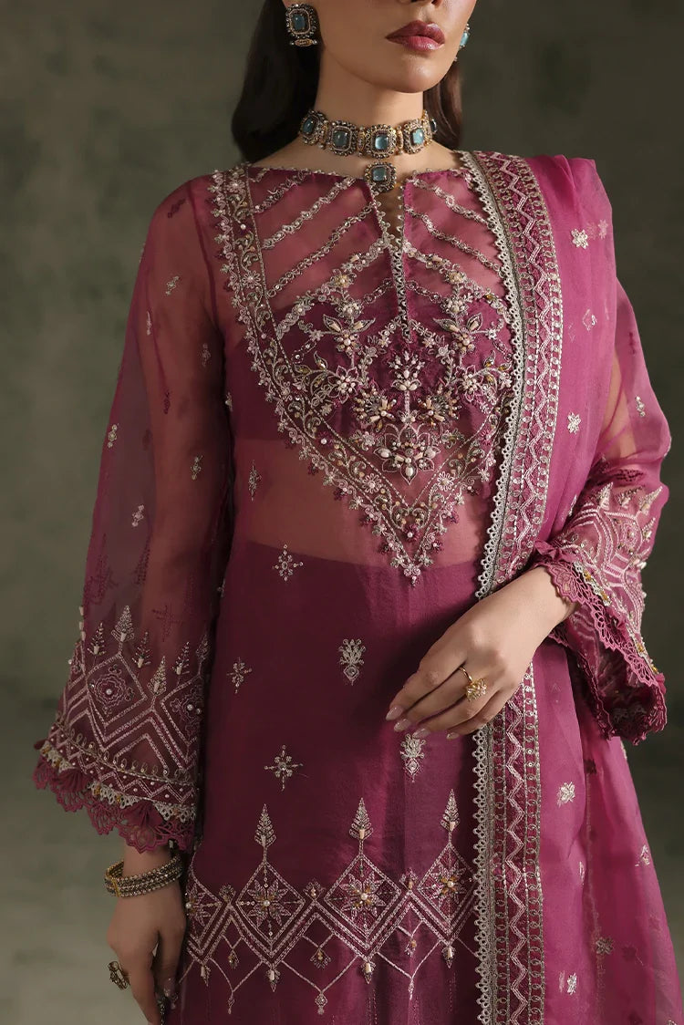 This stunning ensemble is crafted on embroidered organza, beautifully detailed with intricate hand embellishments. The shirt front panel is adorned with delicate artistry, featuring pearls, Japanese cut dana, multi-color crystals, kulfi, bethki, drops, and plate sitara that create a subtle sparkle. The matching embroidered front border and 1.5-yard embellished sleeves enhance the design with refined charm, while the embroidered organza back and border maintain elegance from every angle.