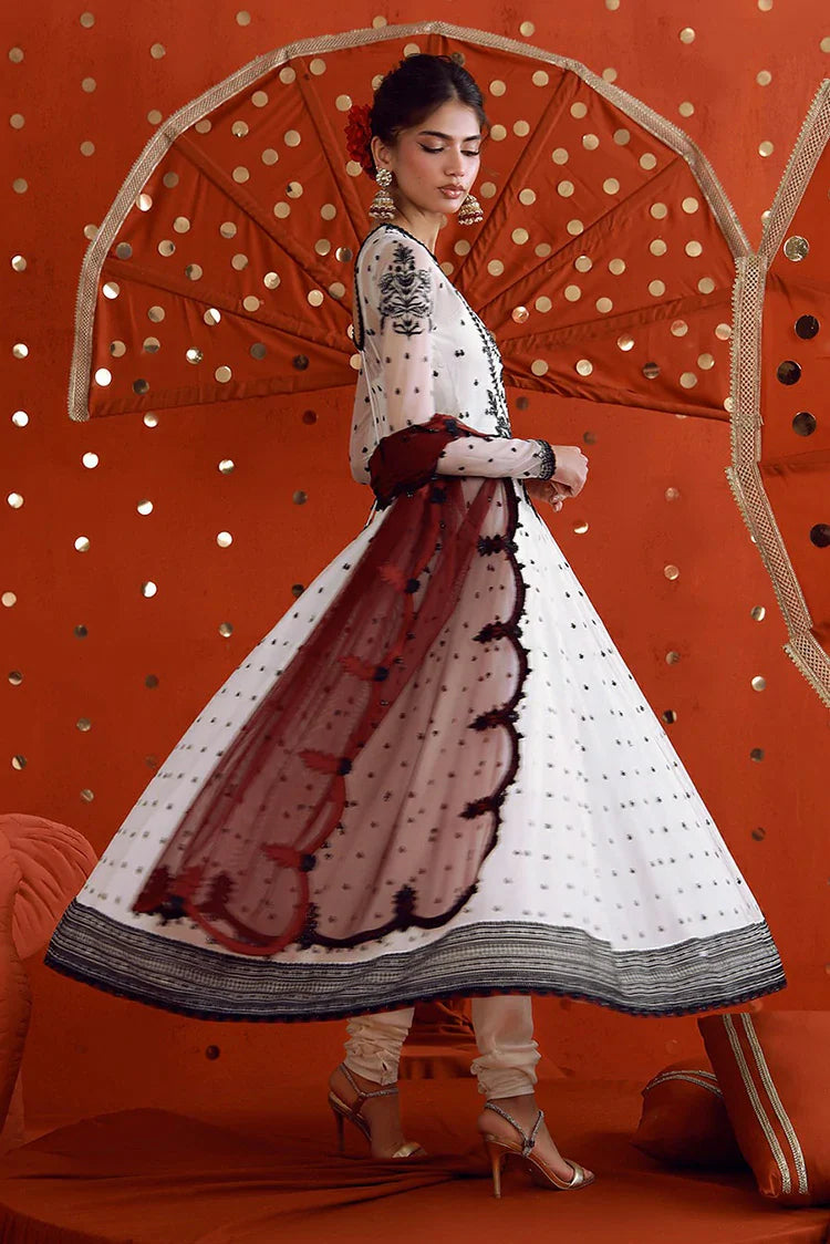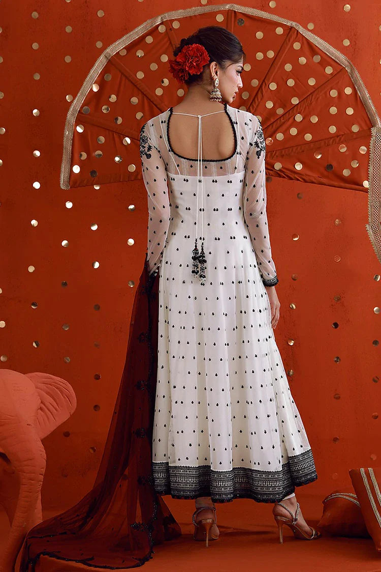 Striking In Its Monochrome Appeal, This Off-White Kalidaar Is A Breathtaking Blend Of Contrast And Craftsmanship. Black Thread And Shimmering Sequins Traverse The Canvas, Creating A Rhythmic Interplay Of Light And Shadow. A Heavily Detailed Neckline Anchors The Design, Flowing Seamlessly Into Kalis Adorned With A Delicate Scattered Chann That Evokes A Sense Of Surreal Allure. Paired With A Contrasting Maroon Dupatta, Intricately Embroidered To Mirror The Richness Of The Ensemble, This Look Is Completed With A Bold Yet Harmonious Finish.