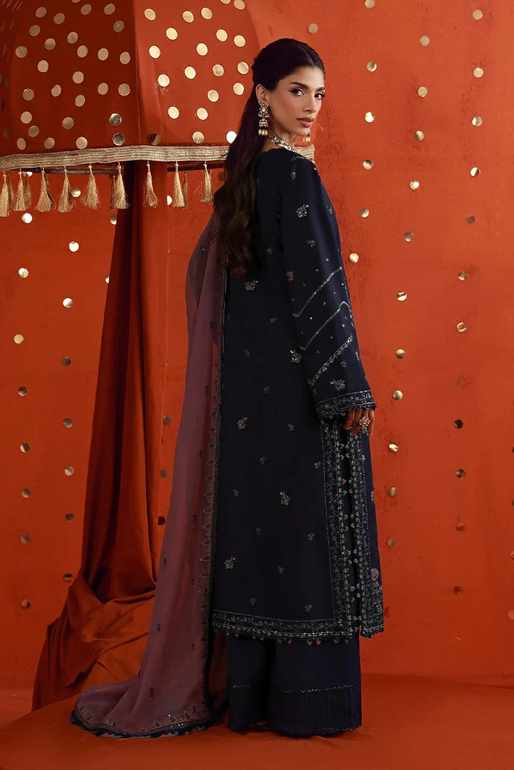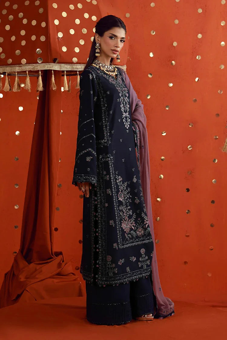 An Elegant Interplay Of Depth And Softness, This Navy Blue Ensemble Redefines Understated Festivity. The Long Shirt Is Intricately Embroidered With Lilac, Navy, Mauve, And Tea Pink Threads, Elevated By Delicate Transparent Sequins That Lend A Soft, Luminous Sheen. The Design Flows Seamlessly Into A Contrasting Mauve Dupatta, Adorned With Minimal Embroidery That Beautifully Balances The Richness Of The Outfit—Creating A Look That Feels Effortlessly Graceful Yet Undeniably Festive.